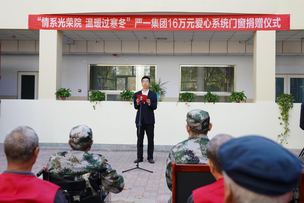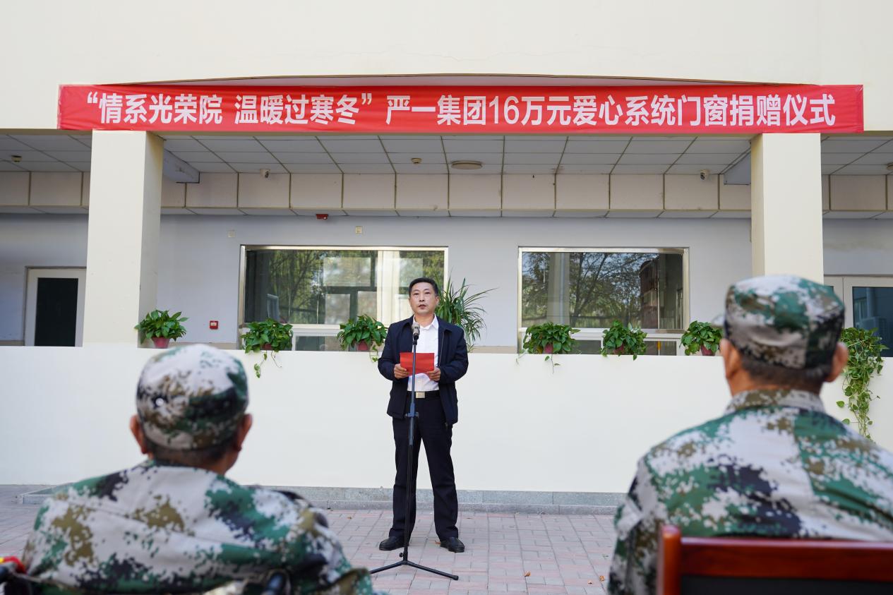 在捐赠仪式上,崔局长表示:“严一集团为衡水市光荣院捐赠价值约16万元的系统门窗这一善举,有效缓解了光荣院设施短缺问题,使退役老兵们感受到了社会的温暖,为加快光荣院社会化建设进程做出了表率。希望全区退役军人事务工作者要以严一集团为榜样,充分发扬“善不以名而为,功不以利而动”的传统美德。”
